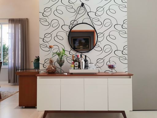 Ampla sala com pé-direito alto integra sala de estar, sala de jantar, copa e cozinha.