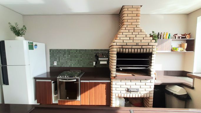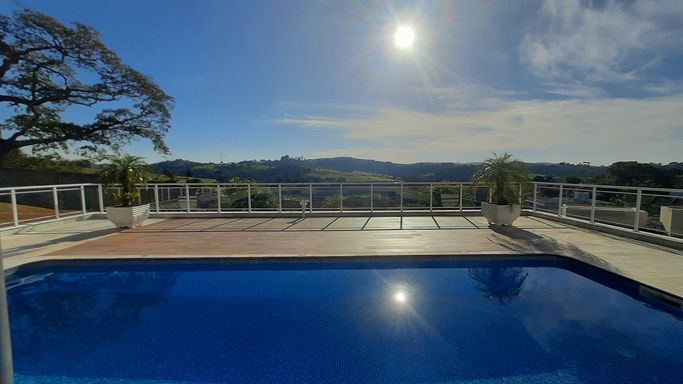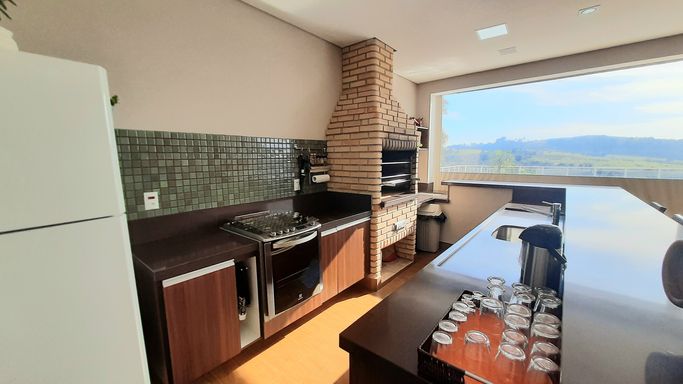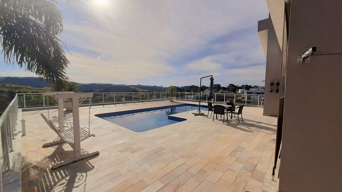 Já a área de lazer é um convite ao bem-estar, tendo o espaço gourmet churrasqueira e fogão, sauna em anexo e uma piscina, aquecida com sistema solar, com uma vista de tirar o folego!