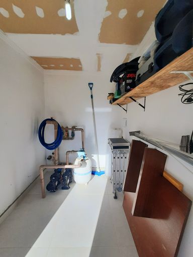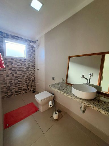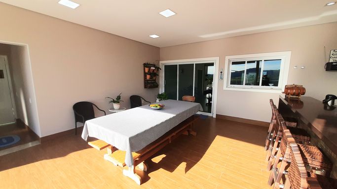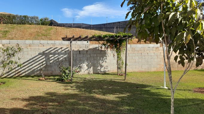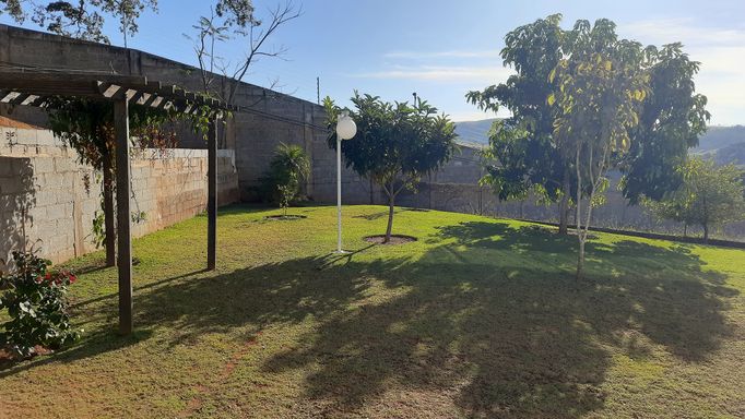 A casa possui um amplo jardim e uma construção externa, podendo ser utilizada como uma área para hóspedes ou para outros fins, com sala, quarto, banheiro e cozinha.